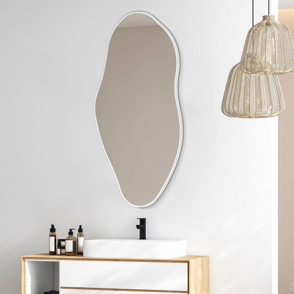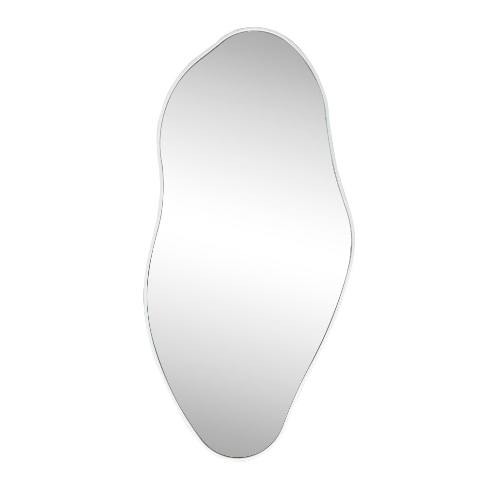 The unique shape of this modern asymmetrical wall mirror adds an Art Deco touch to any space. The soft curves are enhanced by a narrow, sculpted frame. This mirror hangs vertically so it’s ideal for a Livingroom, bedroom or entry area.