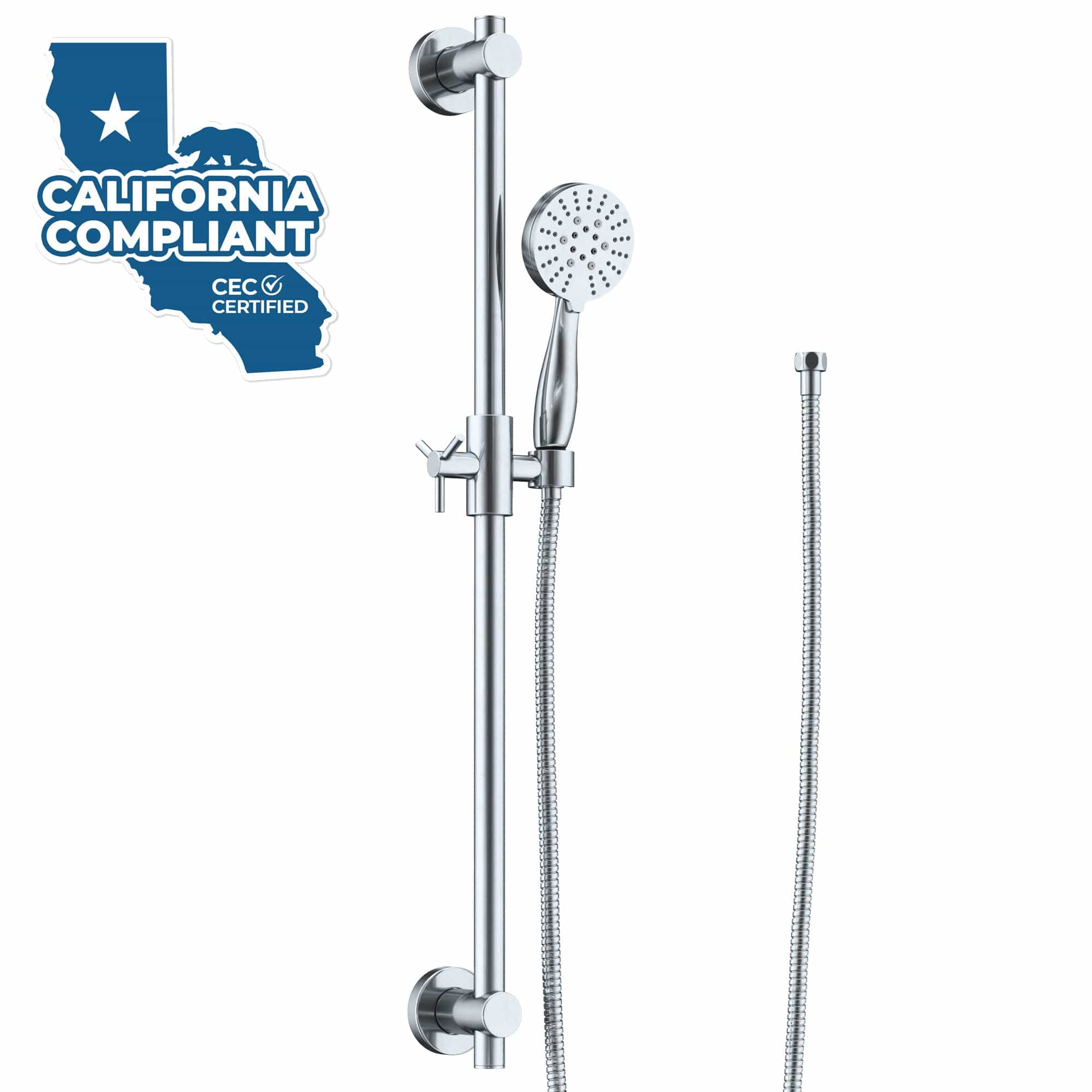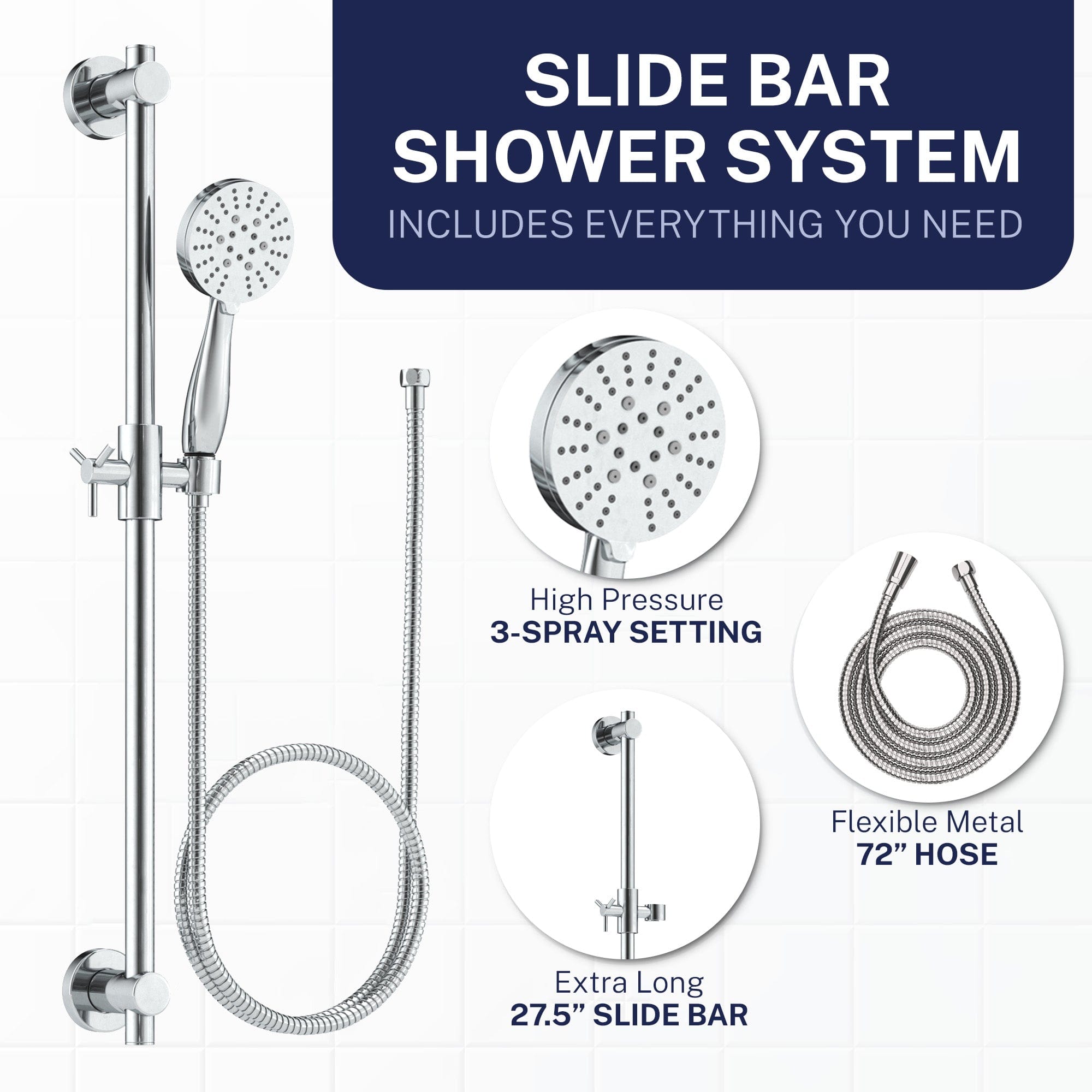 This complete set includes everything you need for putting three dynamic spray options within reach of the entire household: 27.5” slide bar, 3-spray handheld shower head, and flexible 72″ shower hose with hygienic silicone inner tubing.