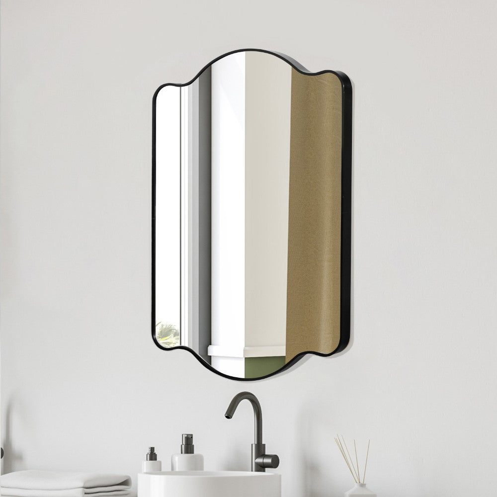 This modern wall mirror has a curved top and bottom to add an Art Deco vibe to any space. This versatile wall-hung design is strengthened by a narrow metal frame. Vertical or horizontal orientations are ideal for a bathroom vanity, bedroom or entry area.